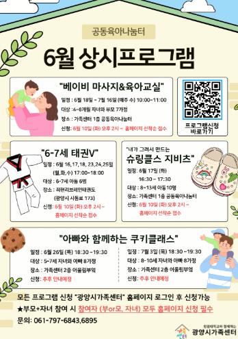 이주화 광양시가족센터장은 “이번 공동육아나눔터 상시프로그램이 부모의 양육 부담을 덜고 자녀의 건강한 성장과 가족 간 소통을 활성화하는 계기가 되길 바란다”며 “앞으로도 가족 구성원이 함께할 수 있는 다양한 맞춤형 프로그램을 지속적으로 발굴하고, 양육 친화적인 사회환경 조성에 힘쓰겠다”고 밝혔다.