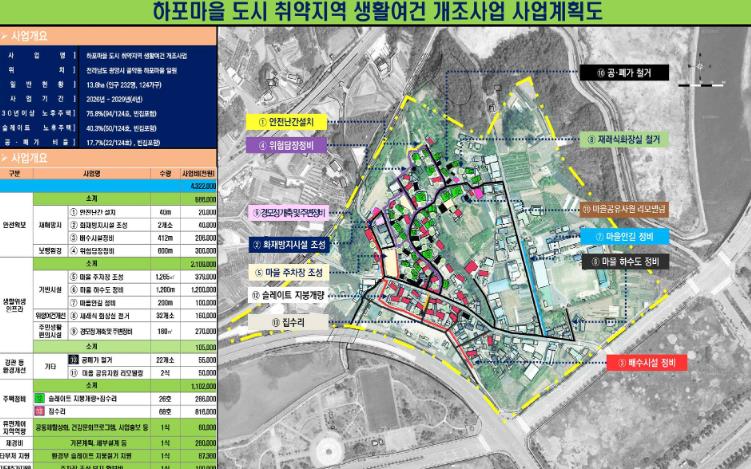 손봉호 광양시 도시과장은 “하포마을은 지금까지 개선 사업 대상지로 선정됐거나 현재 개선을 추진 중인 도촌, 익신지구와 함께, 앞으로 생활 여건이 노후된 도시지역 내 취약지역의 개선을 위한 조치가 이뤄지게 된다”며 “공공하수도 보급과 저지대 배수로 정비, 노후 주택 정비, 휴먼케어 및 주민역량 강화 프로그램 등을 통해 주민들에게 실질적인 혜택이 돌아갈 것으로 기대되는 만큼, 사업을 성공적으로 추진하겠다”고 말했다.