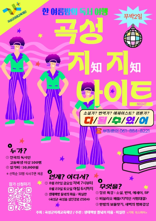 행사는 한 여름밤의 독서여행‘곡성지지(知知) 나이트’라는 주제로 생태책방 들녘의 마음, 미실란에서 진행하며, 참여 대상자는 독서를 좋아하는 고등학생 이상 100명이다. 장르를 불문하고 독서에 관심이 많은 관내·외 사람들이 모여 ‘느슨한 연결’을 경험하고, 가족, 친구, 연인 등 관계를 벗어나 뜻밖의 인연을 만들고, 곡성군미래교육재단이 추구하는 독서교육을 알리고자 기획됐다.