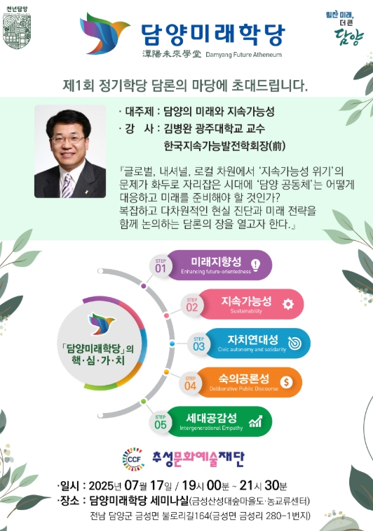 이번 정기학당은 인문과 자연, 정원과 예술이 어우러진 담양의 정체성을 바탕으로, 다양한 세대가 지역의 지속가능한 미래에 대해 자유롭게 토론하고 공감하는 열린 담론의 마당이다.