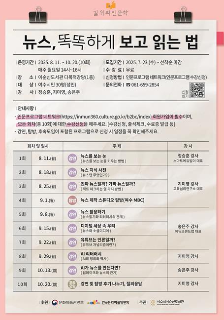 일반 인문 프로그램인 ‘길 위의 인문학’은 ‘뉴스 똑똑하게 보고 읽는 법’을 주제로 8월 11일부터 10월 20일까지 총 10회 진행된다.