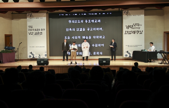 연극에서는 헌법 초안을 놓고 열띤 토론을 벌이고, 1948년 7월 17일 헌법을 공포하는 낭산 선생의 모습이 연출돼 당시의 열정을 현재에 전했다.