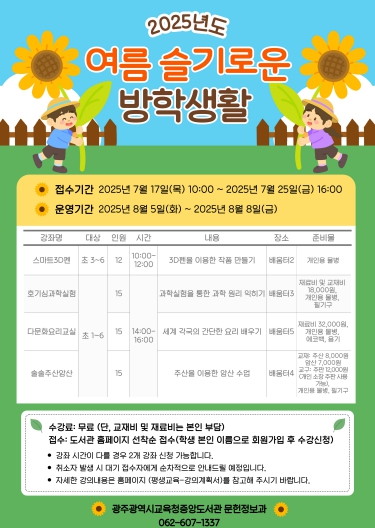 김정희 광주중앙도서관장은 “여름방학을 맞아 초등학생들이 도서관에서 다양한 체험 프로그램에 참여하며 즐겁고 유익한 시간을 보내길 바란다”고 말했다.