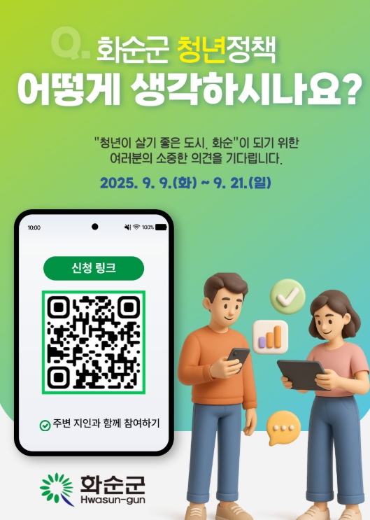 조미화 인구청년정책과장은 “청년의 생각이 곧 화순의 미래를 바꾸는 힘”이라며, “이번 설문조사는 청년이 주도하는 청년정책 추진의 중요한 출발점이다. 화순의 많은 청년들이 설문에 참여하길 바란다”라고 말했다.