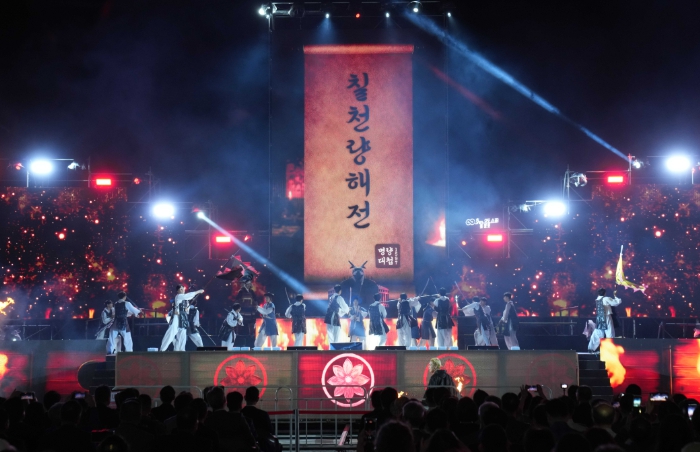가장 큰 주목을 받은 주제공연은 해전 당시 판옥선을 재현한 초대형 무대와 첨단 디지털 기술, 배우들의 불꽃쇼 등 액션활극으로 관람객들에게 압도적 몰입감을 선사하며 뜨거운 호응을 얻었다.
