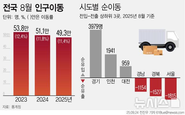 24일 통계청이 발표한 '2025년 8월 국내인구이동통계'에 따르면 8월 중 국내 인구이동자 수는 전년 동월(51만1000명) 대비 3.5%(-1만8000명) 줄어든 49만3000명을 기록했다.