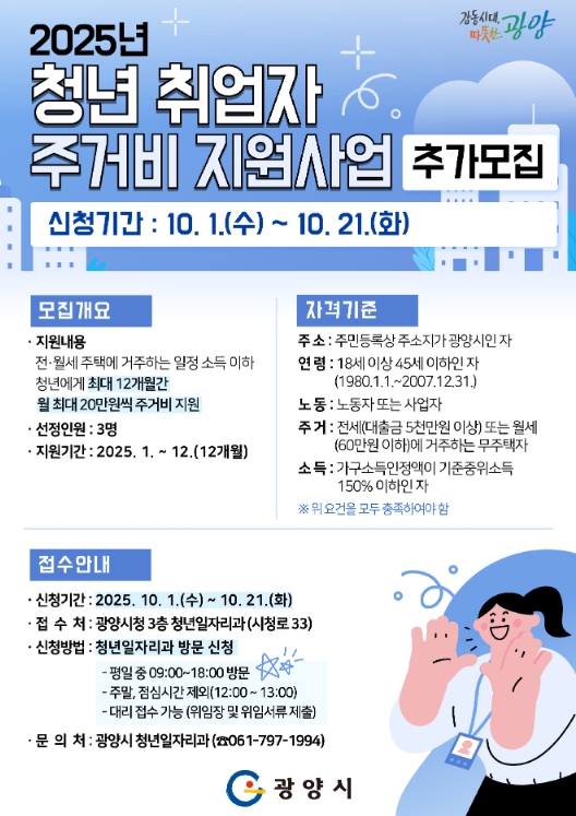 신청은 10월 1일부터 10월 21일까지 광양시청 청년일자리과(3층) 방문 접수하면 된다.