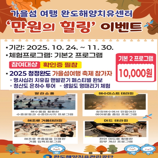 ‘만원의 힐링’ 이벤트는 ‘완도왔섬, 치유됐섬’을 주제로 개최되는 ‘2025 청정 완도 가을 섬 여행’을 하는 관광객이 가을 섬 여행과 함께 부담 없이 해양치유 프로그램을 즐길 수 있도록 마련됐다.