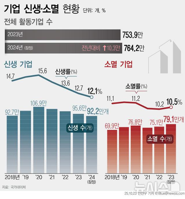 반면 소멸기업은 79만1000개로 전년보다 4만개(5.3%) 증가해 통계 작성 이래 가장 높은 수준을 기록했다. 이에 따라 전체 활동기업 중 소멸기업 비율인 소멸률도 10.5%로 전년보다 0.3%p 상승했다.