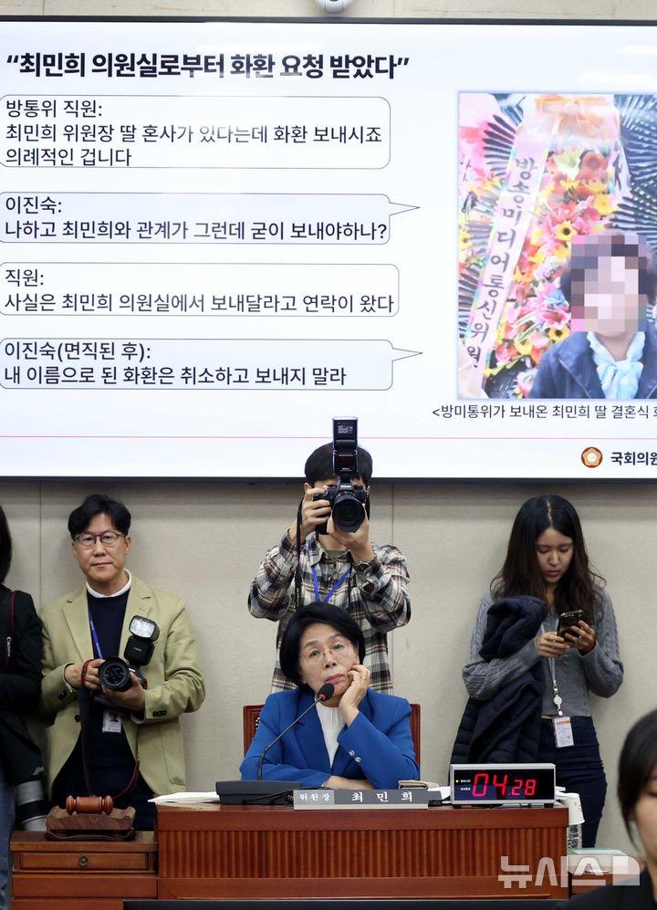 김장겸 의원의 의혹 제기에 대해서는 "위원장실에서는 방미통위에 화환을 요청한 바가 없다는 답이 왔다"며 "최민희 의원실의 어떤 직원이 보내달라고 했는지 확인해주면 그 직원에게 물어보도록 하겠다"고 말했다.