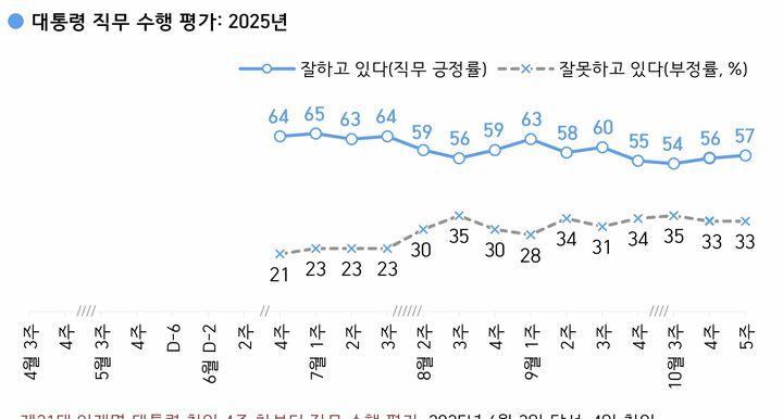 직전 조사(10월 4주차) 대비 긍정 평가는 1%포인트 올랐고 부정 평가는 동일했다.