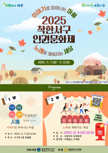김이강 서구청장은 “이번 인권문화제가 지역사회에 인권 존중의 가치를 확산시키는 공감의 장이 되길 바란다”며 “많은 주민이 함께 참여해 착한도시 서구를 함께 만들어 가길 기대한다”고 말했다.