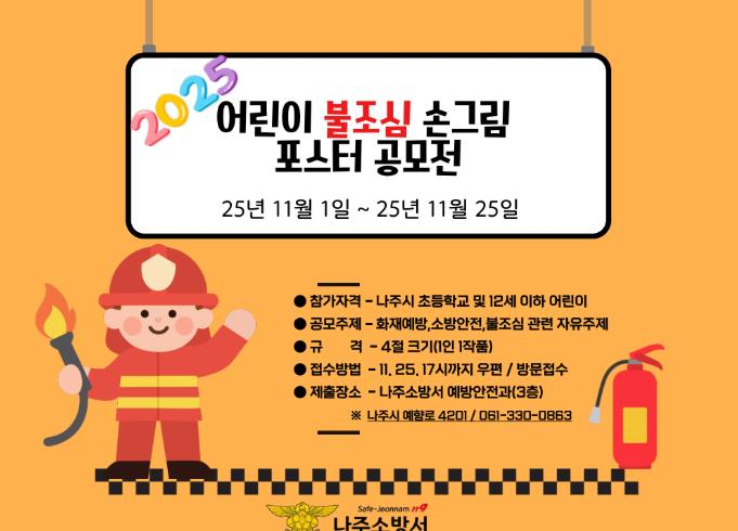 작품 제출은 11월 25일까지 나주소방서 예방안전과에 직접 방문하거나 우편으로 접수하면 된다.