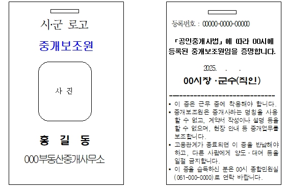 신분증은 사진, 이름, 중개사무소 명칭 및 등록번호가 기재되고 각 신분증마다 공인중개사는 파란색, 중개보조원은 노란색으로 구분하여 공인중개사와 중개보조원을 혼동하여 발생하는 문제점에 대해서 보완할 수 있는 계기를 마련했다고 설명했다.