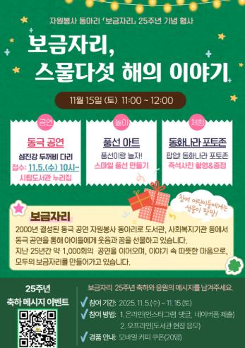 윤정임 보금자리 회장은 “시민들과 함께한 25년은 매 순간이 감사와 감동의 시간이었다”며 “이번 행사를 통해 봉사의 기쁨을 함께 나누고 싶다”고 전했다.