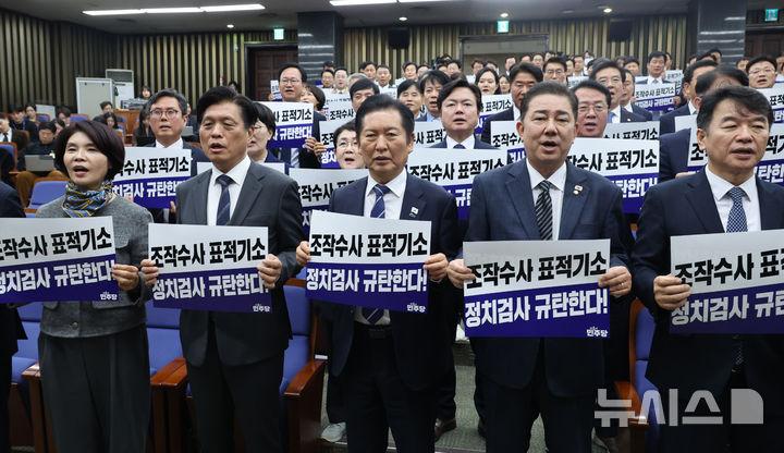 민주당은 이날 의총 직전 검찰 규탄 피켓 시위를 열고 '법치 부정 집단 항명 정치검사 징계하라', '조작 수사 표적 기소 정치검사 규탄한다', '항소 자제 사실 왜곡 정치검사 규탄한다', '정치검사 특권 철폐 집단 항명 단죄하라' 등 구호를 외치기도 했다.