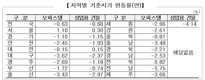 국세청이 사전 공개한 기준시가에 따르면, 전국 오피스텔은 전년 대비 0.6% 하락, 상업용 건물은 전년 대비 0.7% 하락했다. 다만 서울 지역 오피스텔과 상업용 건물 기준시가는 각각 1.1%, 0.3%씩 상승한 것으로 나타났다.