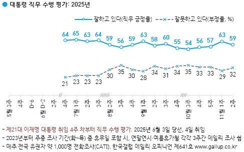 대통령 직무 수행을 긍정 평가한 응답층(590명)에게 이유를 물은 결과, 외교(30%), 경제·민생(14%), 전반적으로 잘한다(7%), APEC(아시아태평양경제협력체) 성과(5%), 직무 능력·유능함(5%), 소통(5%), 관세협상 타결(3%), 서민 정책·복지(3%) 등의 순으로 나타났다.