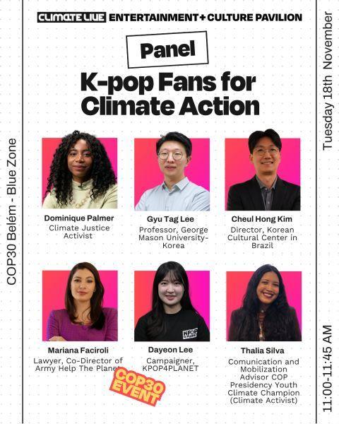 20일 K-팝 팬들이 주도하는 기후 캠페인 플랫폼 케이팝포플래닛에 따르면, 지난 18일(현지시간) COP30 본회의장 '블루존'에서 주브라질한국문화원 주최로 '케이팝 팬들의 기후행동' 패널 토론이 열렸다.