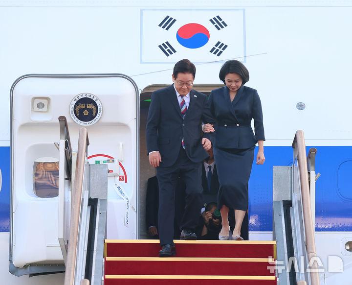 이 대통령은 김혜경 여사와 함께 전용기에서 내려 환영 인사들과 악수하며 인사를 나눴다.