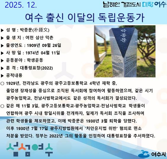 여수시 관계자는 “박종문 선생의 고귀한 항일정신을 되새기며 앞으로도 지역 출신 독립운동가들의 숨은 공적을 지속적으로 조사·발굴해 나가겠다”고 밝혔다.