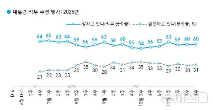 한국갤럽이 지난 25~27일 전국 만 18세 이상 유권자 1000명을 대상으로 조사한 결과 이재명 대통령의 직무 수행 긍정평가는 60%, 부정 평가는 31%로 각각 나타났다. 9%는 의견을 유보했다.