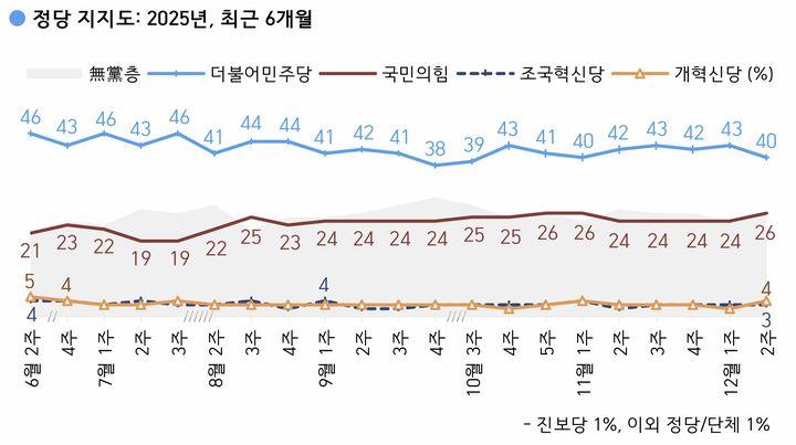 이어 개혁신당 4%, 조국혁신당 3%, 진보당 1% 순이었다. 지지하는 정당이 없는 무당층은 26%로 나타났다.