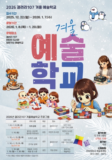 이번 겨울 예술학교에서는 갤러리 107은 성인 프로그램을 운영하고 찾아가는 예술학교를 통해 곡성어린이 도서관과 협업하는 ‘달리는 상상력’ 말 모형 조형활동과 곡성 관내 어르신들을 위해 직접 마을로 찾아가는 ‘마을로 스미는 예술 한 스푼’ 프로그램을 무료로 진행한다.