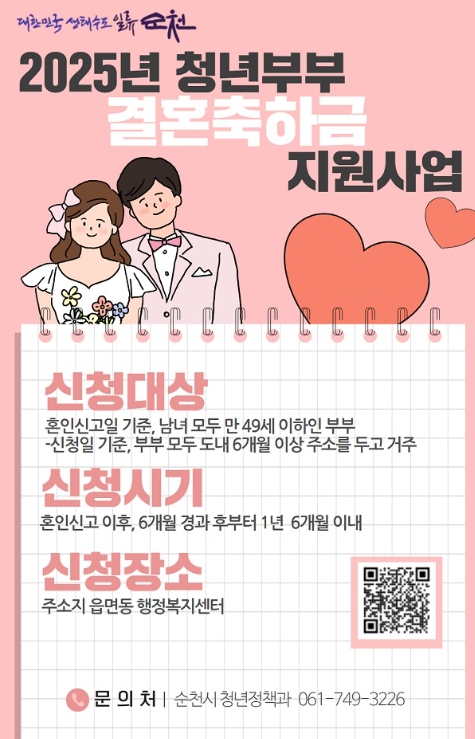 2026년 청년부부 결혼축하금 지원사업 신청은 주소지 관할 읍면동 행정복지센터 방문 또는 온라인(전남아이톡)을 통해 가능하며, 기타 자세한 사항은 순천시청 홈페이지에서 확인할 수 있다.