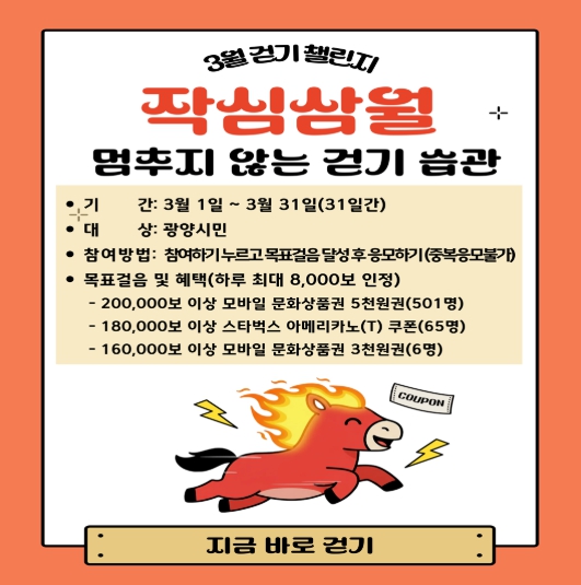 한편, 광양시는 생활 속 신체활동을 활성화하고 시민 건강증진을 도모하기 위해 모바일 걷기 앱 ‘워크온’을 활용한 걷기 챌린지를 매월 운영하고 있으며, 현재 광양시 공식 커뮤니티에는 누적 1만 221여 명이 가입해 활발히 참여하고 있다.