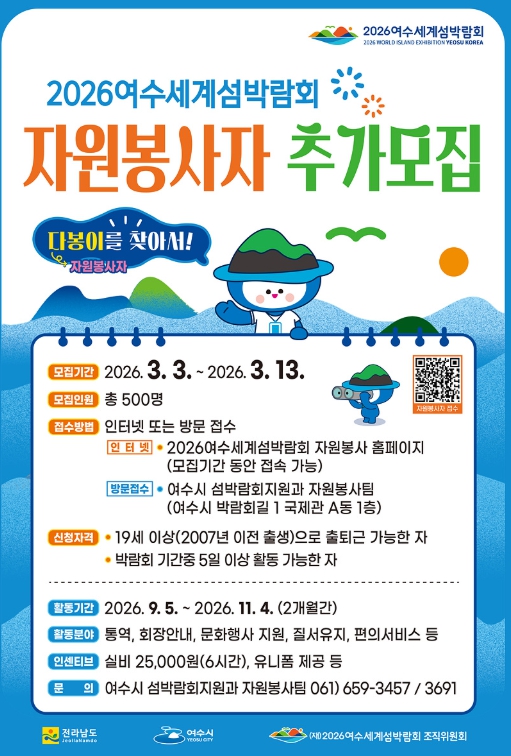 참여를 희망하는 시민은 2026여수세계섬박람회 자원봉사 누리집을 통해 온라인으로 신청하거나 여수시 섬박람회지원과 자원봉사팀(여수시 박람회길 1 국제관 A동 1층)을 방문해 접수할 수 있다.