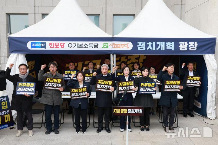 서왕진 조국혁신당 원내대표는 이날 오후 국회 본청 앞에서 열린 '개혁진보 4당 정치개혁 농성 출범식'에서 "정청래 더불어민주당 대표는 어제(8일) 기자회견에서 '6·3 지방선거 승리로 내란을 확실히 심판하겠다'고 말했다"며 "극우 내란 본당 국민의힘에게 생존의 요새가 되는 이 낡은 정치 구조를 혁파하지 않는다면 지방선거에서의 '진정한 승리'는 요원하다"고 했다.