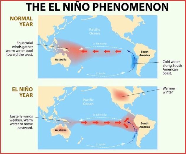 엘니뇨 기간에는 태평양 중부와 동부의 평년보다 따뜻한 해수가 기상 패턴을 변화시켜 전 세계적으로 폭염, 가뭄, 홍수를 불러일으킨다. 반대로 대서양의 허리케인은 약화할 수 있다.