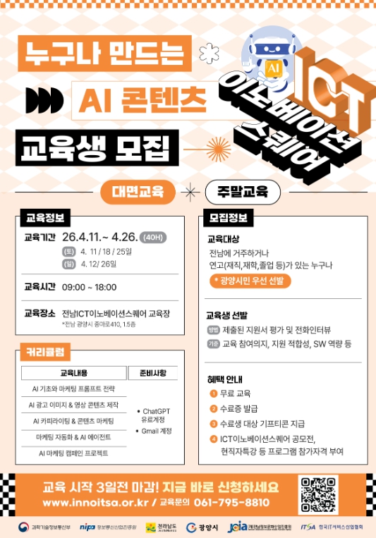 한편, 이번 교육은 과학기술정보통신부와 정보통신산업진흥원이 주관하고, 전라남도와 광양시가 지원하며, (재)전남정보문화산업진흥원과 한국IT서비스산업협회가 협력해 추진하는 국가직접지원사업의 일환으로 운영된다.