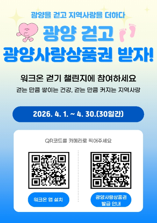 한편, 광양시는 시민의 일상 속 신체활동을 늘리고 건강증진을 위해 모바일 걷기 앱 ‘워크온’을 활용한 걷기 챌린지를 매월 운영하고 있으며, 광양시 공식 커뮤니티에는 현재 1만 327여 명이 가입해 꾸준한 참여가 이어지고 있다.