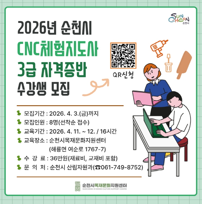 시 관계자는 “이번 교육을 통해 수강생들이 목공 전문 기계에 대한 이론과 실습을 함께 익히고 자격증 취득까지 이어지길 기대한다”며 “목공 분야 취업을 준비하는 시민들에게 실질적인 도움이 되기를 바란다”고 말했다.