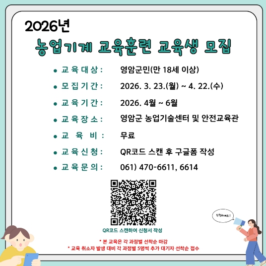 이정 영암군농업기술센터소장은 “농기계 안전은 농업인의 생명과 직결되는 중요한 요소”라며 “많은 농업인이 교육에 참여해 안전한 농작업 환경을 만들길 바란다”고 말했다.
