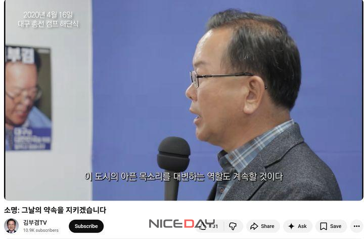 유튜브 채널 '김부겸TV'에 '소명: 그날의 약속을 지키겠습니다'라는 제목으로 올라온 해당 영상은 6년 전인 2020년 4월16일 대구 총선 캠프 해단식 장면으로 시작한다.