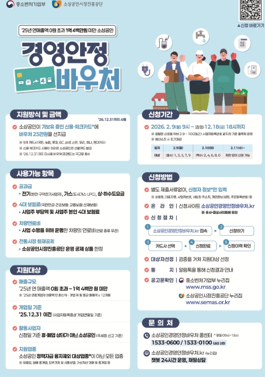 이번 사업은 중소벤처기업부와 소상공인시장진흥공단이 추진하는 정책으로, 공과금과 4대 보험료 등 고정비용에 사용할 수 있는 바우처를 지원해 소상공인의 실질적인 경영 안정을 돕기 위한 것이다.