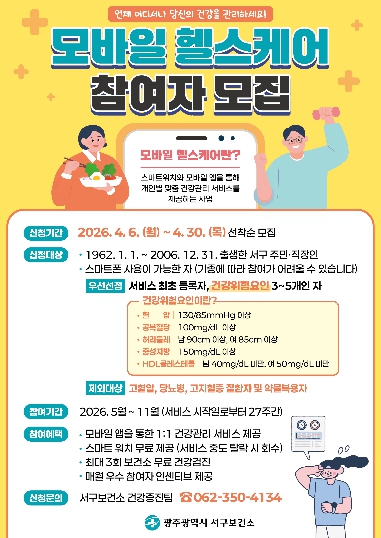 김이강 서구청장은 “모바일 헬스케어는 일상 속에서 실천 가능한 건강관리 방법을 제시하는 프로그램”이라며 “보다 많은 주민들이 참여해 건강한 생활습관을 형성하길 바란다”고 말했다.