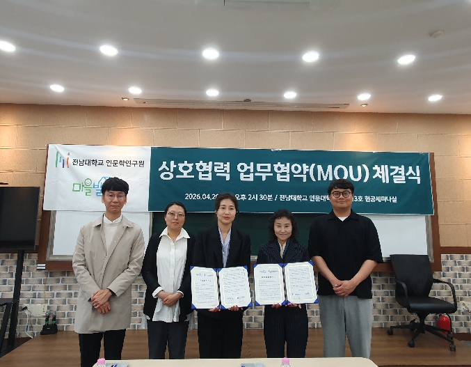 22일 전남대에 따르면, 인문학연구원은 지난 4월 20일 오후 2시 30분, 인문대학 1호관 313호 현공세미나실에서 마을발전소(대표 박미자)와 교육 및 학술 활동 촉진을 위한 업무 협약(MOU)을 체결했다.