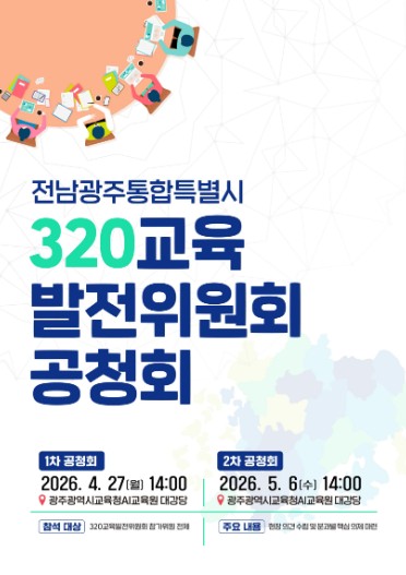 시교육청은 오는 27일과 5월 6일 광주AI교육원에서 광주・전남 교육행정 통합 대비 시도민 의견수렴을 위한 ‘전남광주통합특별시 320교육발전위원회’ 공청회를 개최한다.