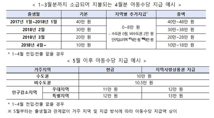 수도권에 사는 2018년 2월생은 30만원, 2018년 3월생은 20만원, 2018년 4월생은 10만원을 받는다. 비수도권이나 인구감소지역이라면 각각 32~38만원, 22만~28만원, 12만~18만원이 들어온다. 이는 1~4월에 전입·전출이 없을 경우 해당된다.