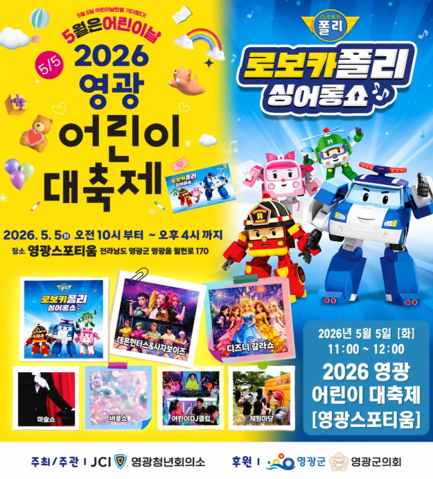 가정행복과장은 “올해 어린이날 행사는 그 어느 때보다 풍성한 체험 부스와 푸드존을 갖춰 아이들이 오감으로 즐길 수 있도록 준비했다”며, “미래의 주인공인 어린이들이 영광에서 마음껏 웃고 즐기며 행복한 추억을 가득 담아가길 바란다”고 전했다.
