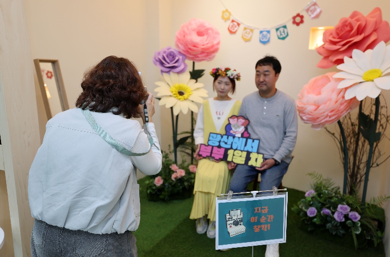 사진 공간(포토존)은 ‘광산에서 부부 1일차’라는 문구와 함께 화사한 봄꽃 장식으로 꾸며졌으며, 촬영한 사진은 무료로 제공된다.