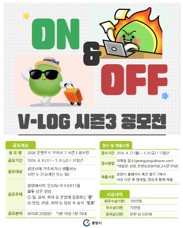 공모 주제는 광양에서의 ‘온(ON)’과 ‘오프(OFF)’를 모두 담은 브이로그 영상이다.