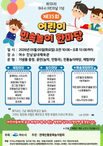 흥국체육관·거북선공원에서는 대한예수교장로회 여수노회가 주관하에 오전 10시 모범 어린이 표창과 함께 태권도 시범, 제기차기, 윷놀이 등 전통 민속놀이와 비즈공예, 자개 키링 만들기 등 다채로운 체험부스가 운영될 예정이다.