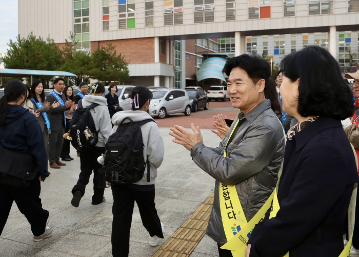 김대중 교육감을 비롯한 도교육청 간부들은 이날 오전 76지구 제2시험장인 봉황고등학교 교문에서 시험을 치르기 위해 들어서는 수험생들을 반갑게 맞이하며 최선을 다해줄 것을 당부했다.