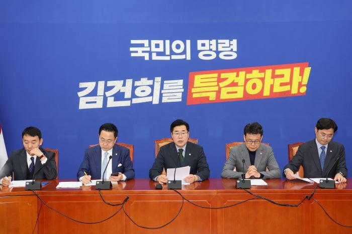 박찬대 원내대표는 이날 오전 국회 본청에서 열린 정책조정회의에서 "김건희 특검법은 국민의 명령이자 역사적 책무"라며 "김건희 특검법 명분은 커지고 민심은 폭발 지경인데 대통령의 상황 인식은 안드로메다에 가 있다"고 말했다.