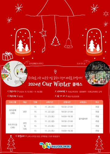 ‘2024년 Our Winter 클래스’는 다가오는 추운 겨울을 맞이해 배움을 통한 성취감을 느끼고 가족이 함께 참여해 행복을 선물하는 프로그램으로 총 6회 진행될 예정이다.